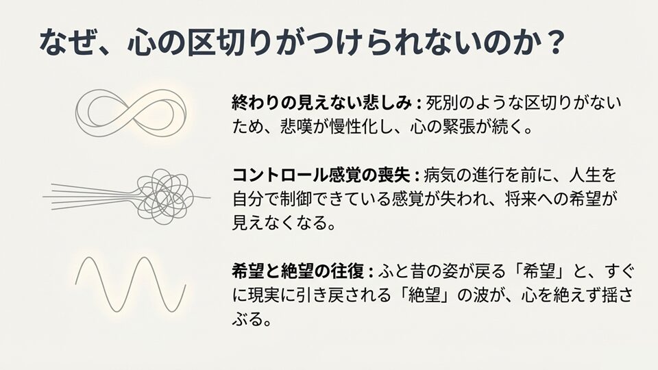 「あいまいな喪失」のつらさは、明確な喪失と異なり、「心の区切り」をつけられないことにあります。その心の区切りを困難にする要素は、以下の3つに分解することができます。