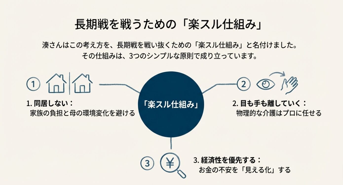 湊さんは、この考え方を「楽スル仕組み」と呼んでいます。楽をするためではなく、長期的に続けるための仕組みです。