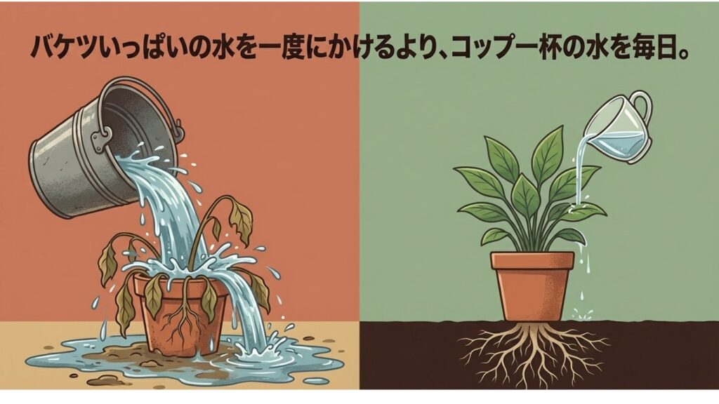 コップ一杯の水を毎日少しずつあげるほうが、根は安定します。