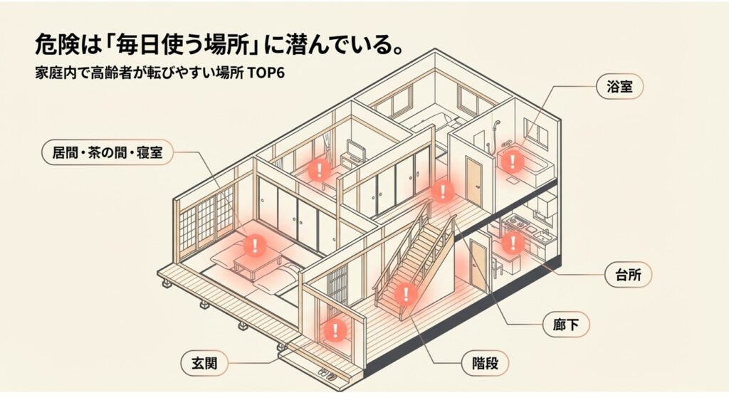 東京消防庁などの調査では、家庭内で転倒する場所の上位は次の通りです。