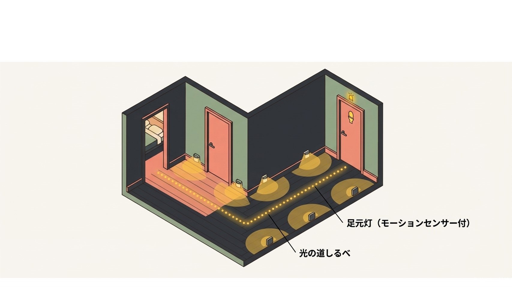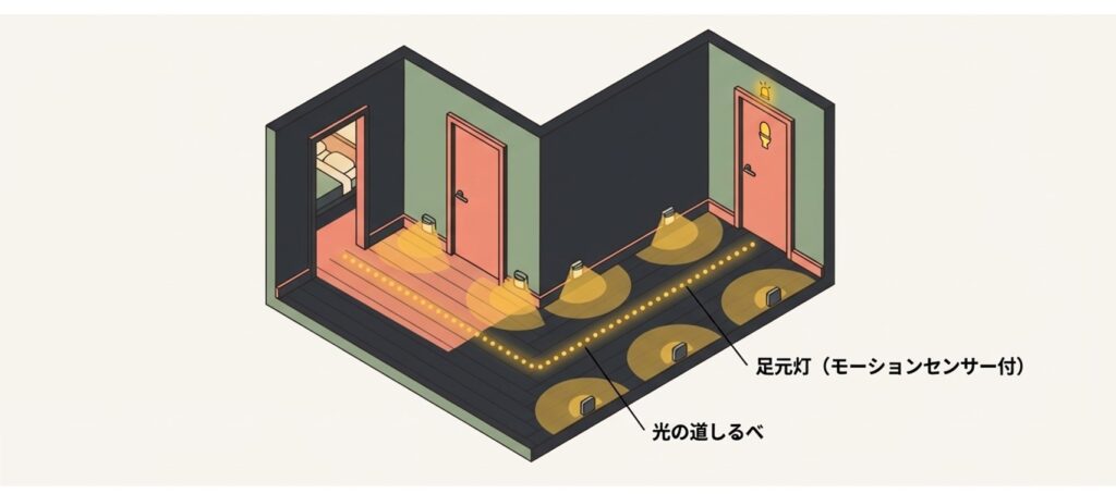 夜中に電気を探さなくても明るくなる環境を作ることが大切です。