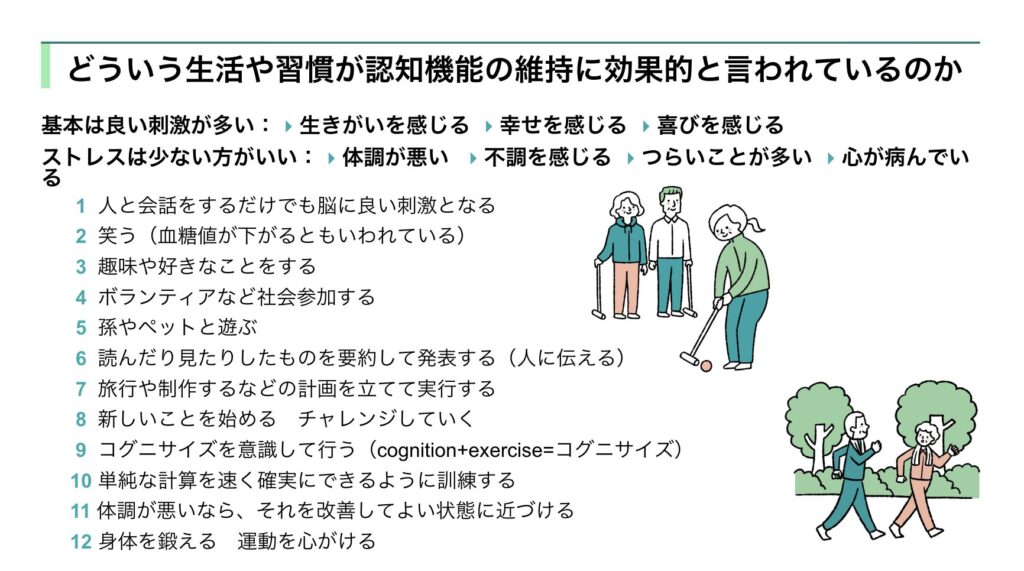 どういう生活や習慣が認知機能の維持に効果的かと言われているのか、お伝えいたします。