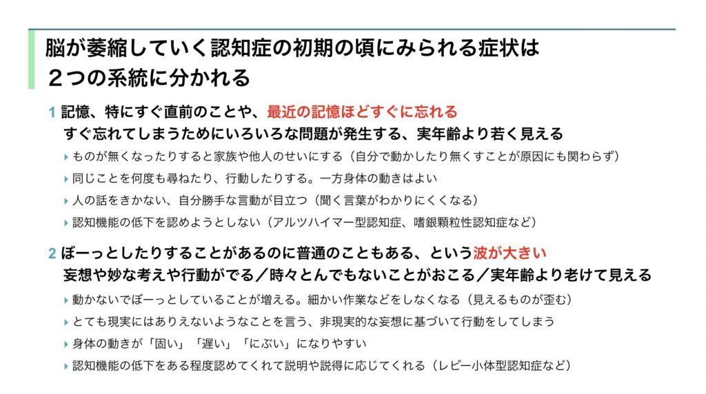 脳が萎縮するタイプの認知症には、大きく分けて2つの初期症状があります。