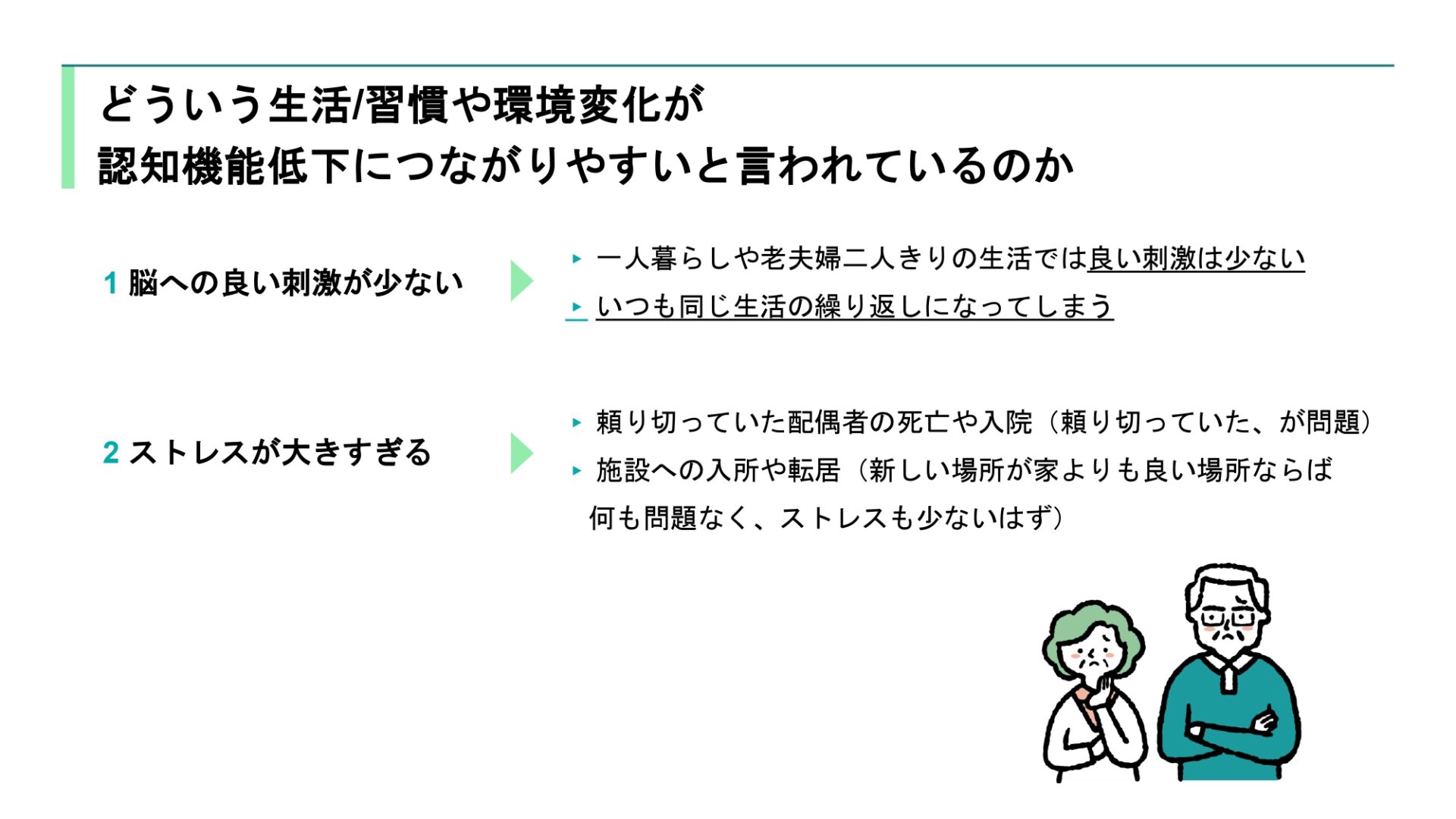2つ目として、ストレスが大きい生活をしていること。これも認知機能の低下につながりやすいです。配偶者の死や施設に入るなどの転居で、ストレスを抱えることがあります。