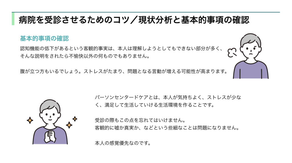 ご本人のために、パーソンセンタードケアを上手に実施することが病院受診のコツ、ひいては認知症ケアの基本です。