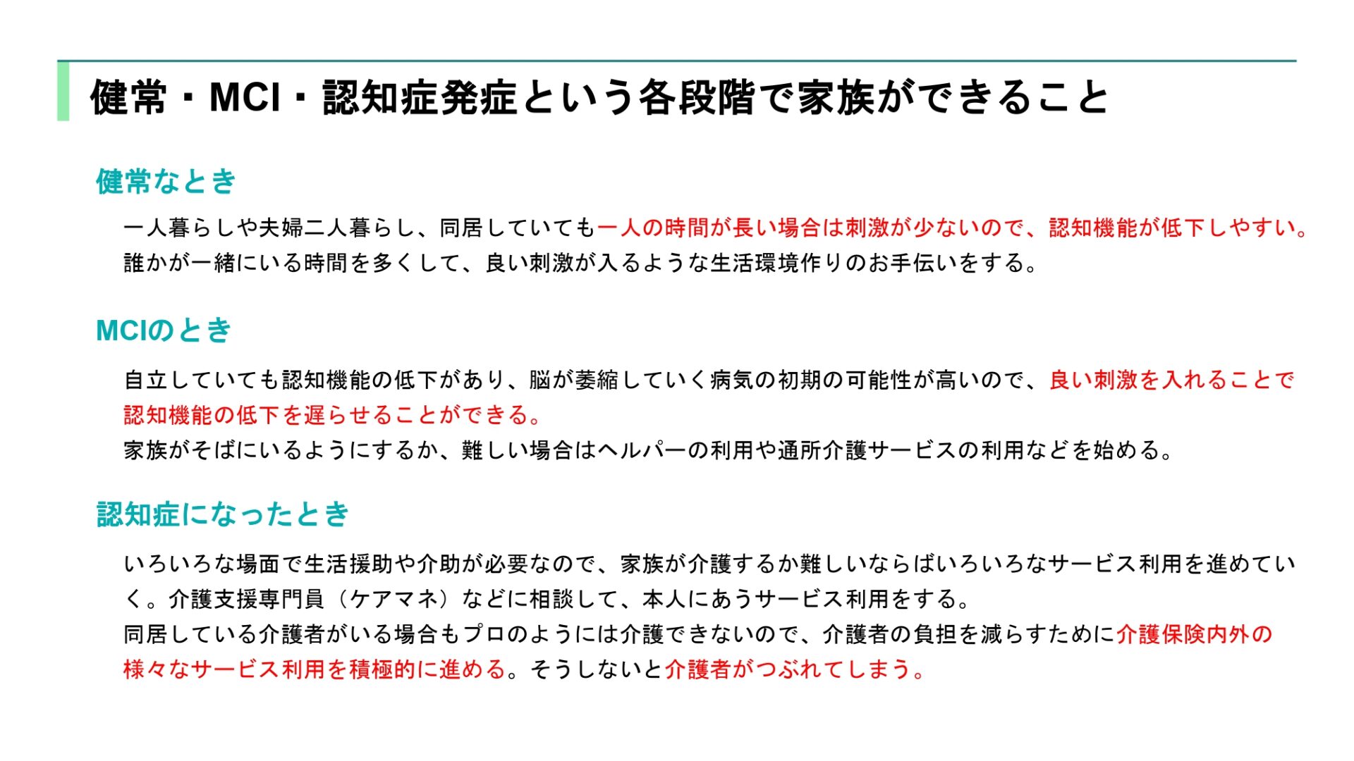 ですが、どのような環境にいたらなりやすいのか・なりにくいかということはわかっているので、ぜひ皆さんもいい刺激を入れる、認知症になりにくい生活環境でお過ごしいただきたいと思います。