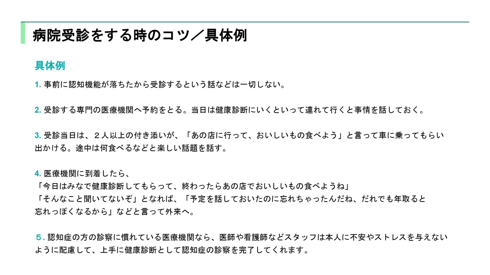 健常者に話すように説明をして、それで納得して連れていけるのであれば問題ありません。MCIの方やレビー小体型認知の方は、ちゃんと説明をすると行っていただける場合も多いです。