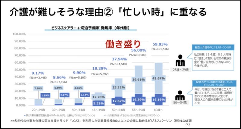 また、介護に関わる家族の数も減ってきていますし、女性の活躍で共働きの家庭が増えているので、介護の担い手が減っています。場合によっては子育てと重なって、いわゆるダブルケアラーになる方もいらっしゃいます。