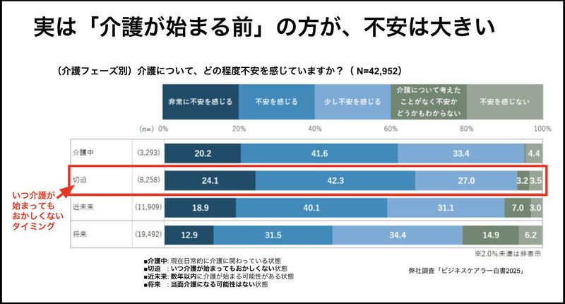 介護中・介護がいつ始まってもおかしくない方(切迫)・介護が近い未来始まる方・介護が将来のどこかで始まる方で、どの程度不安の大きさに違いがあるのかデータをとったところ、切迫している方が「もっとも不安を感じる」ということがわかりました。
