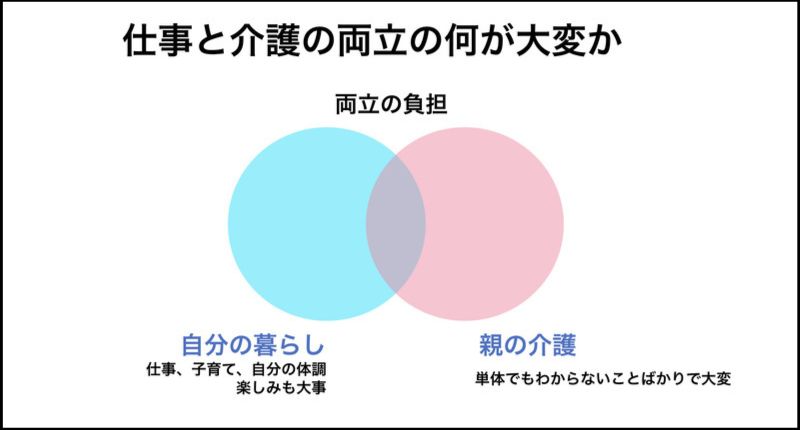 仕事と介護の両立では、、自分の暮らしと親の介護が重なってしまう部分の負担が大変になります。