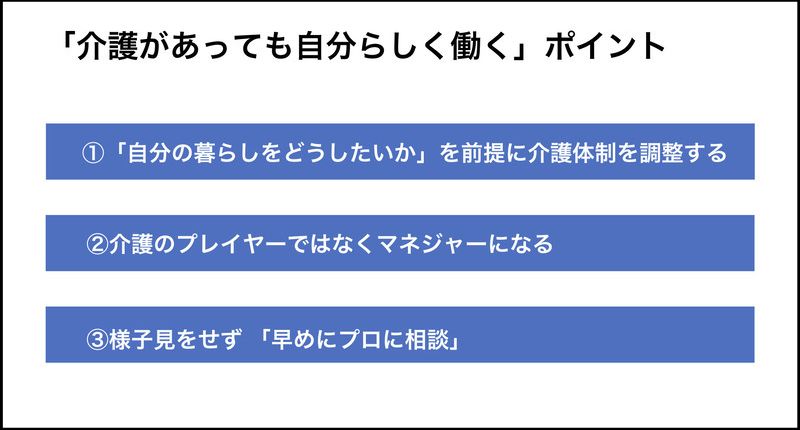 「介護」はコントロールすることができません。また、基本的には負担が増えていくことが前提です。その介護に合わせて調整していくのではなく、まずは自分の暮らしをどうしたいのかということを決めて、そこから介護体制の調整をしていくという順番を守っていきましょう。