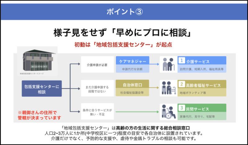 公的サービスを活用するために、様子見をせず、早めにプロに相談してください。プロというのは、地域包括支援センターのことです。親御さんの住所地で管轄が決まっています。介護申請をしなければならなくなった時にも教えてくれますし、申請をする前に相談することもできます。よく使われている民間サービスの紹介もしてくれますし、親御さん本人に話せてないという場合でもご相談可能です。