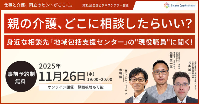 ▼第31回 全国ビジネスケアラー会議【親の介護、どこに相談したらいい?身近な相談先「地域包括支援センター」の”現役職員”に聞く!】