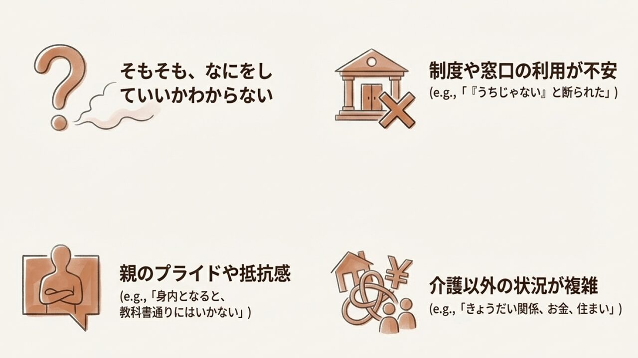 受診や介護の話題を嫌がる、拒否する、プライドが傷つきやすいなど、親の反応そのものが話を切り出しにくくする場面が多くありました。まわりが慎重にならざるを得ず、結果として動きにくい空気ができていました。