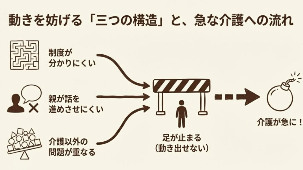 ここまで見てきたコメントをあらためて眺めると、介護前に「そろそろ動かなきゃ」と思いながらも足が止まってしまう背景には、三つの要因が重なっていました。