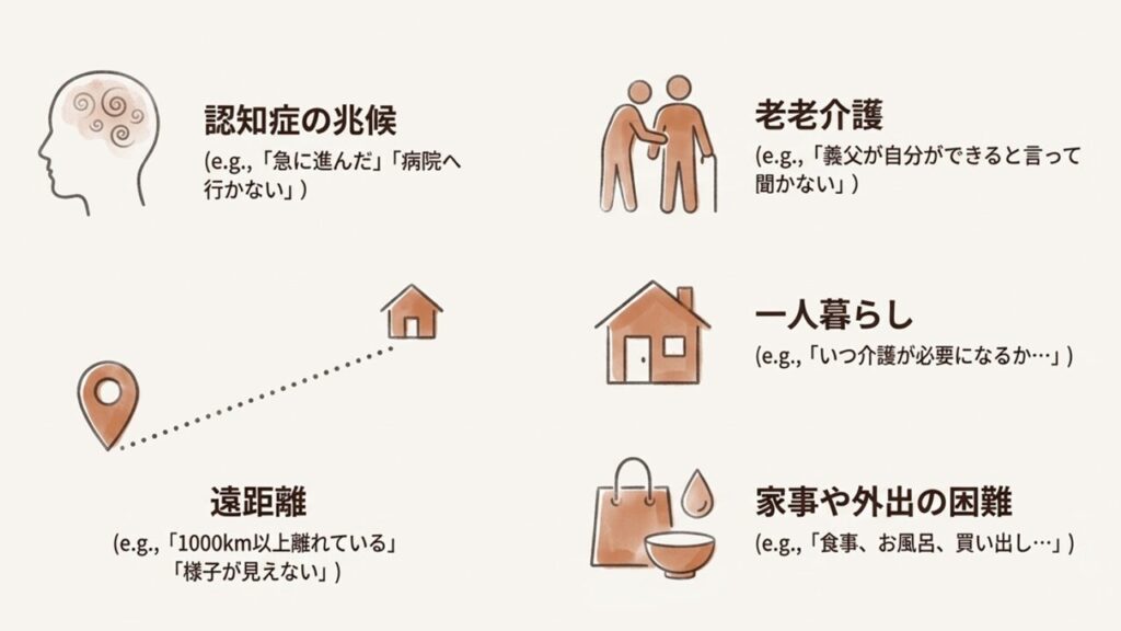 物理的な距離が壁となり、緊急時の対応や日々の様子が見えないことへの不安が綴られています。