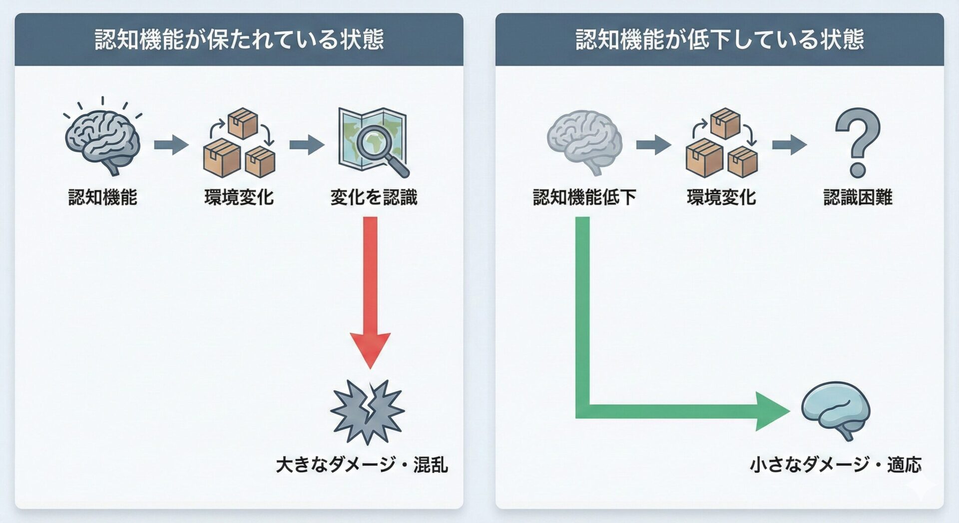 | ダメージが小さい | すでに自宅がどこなのか認識できていない、日常の文脈が保てていない。 | そもそも「環境の変化」自体を認識しにくいため、心理的なダメージは比較的小さい。 |