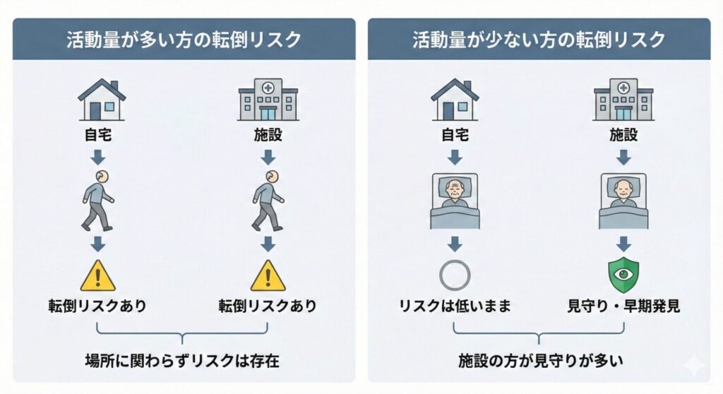 「施設で転倒して骨折した」という話を聞くと不安になりますが、転倒リスクは場所(自宅か施設か)よりも、ご本人の「活動量」に依存します。