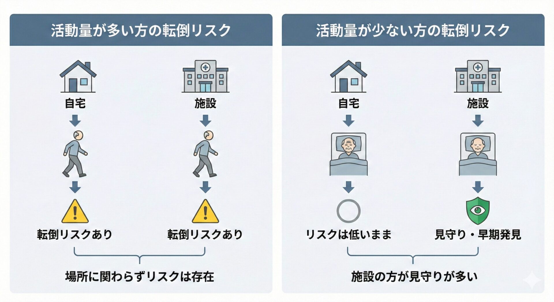 活動量が多い以上、自宅でも施設でも転倒リスクはあります。「施設だから転んだ」のではなく「動けるから転ぶリスクがある」状態です。