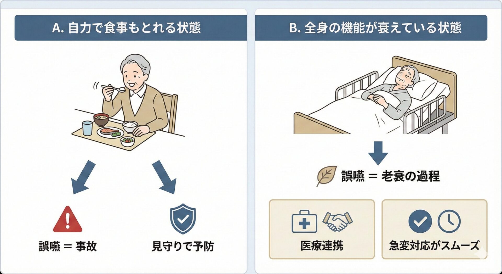 「施設に入れたら誤嚥で亡くなってしまった」という話を聞くと不安になりますが、その原因がケアの方法や見守り体制にあるのか、老衰に伴うほぼ不可避なものなのかで意味合いが大きく変わります。