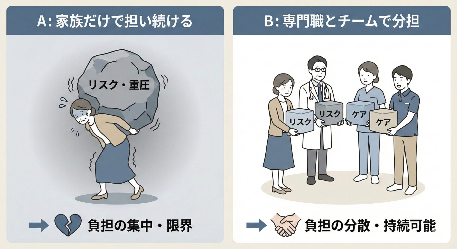 「施設に預ける=見捨てる」ではありません。日常の負担が増えてきている時は、ご家族だけで抱え続けるのではなく、プロと分担するチームケアへの移行の段階と捉えてください。施設であれ在宅であれ、ご本人のためにも、負担の分散を考えるタイミングです。