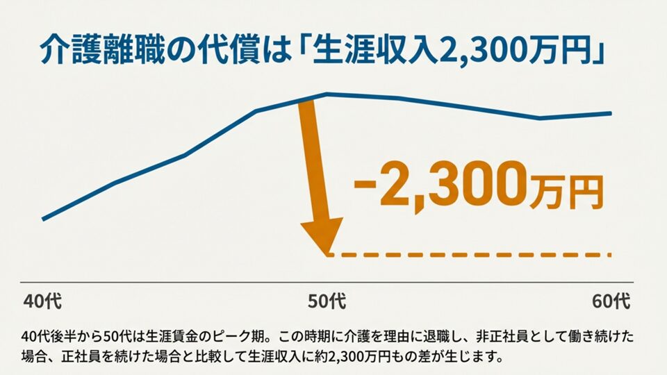 仮に、この時期に介護を理由に退職し、その後、不安定な雇用形態などで働いた場合、正社員を続けた場合と比較して、65歳までの生涯収入に約2,300万円もの差が生じるというデータがあります 。