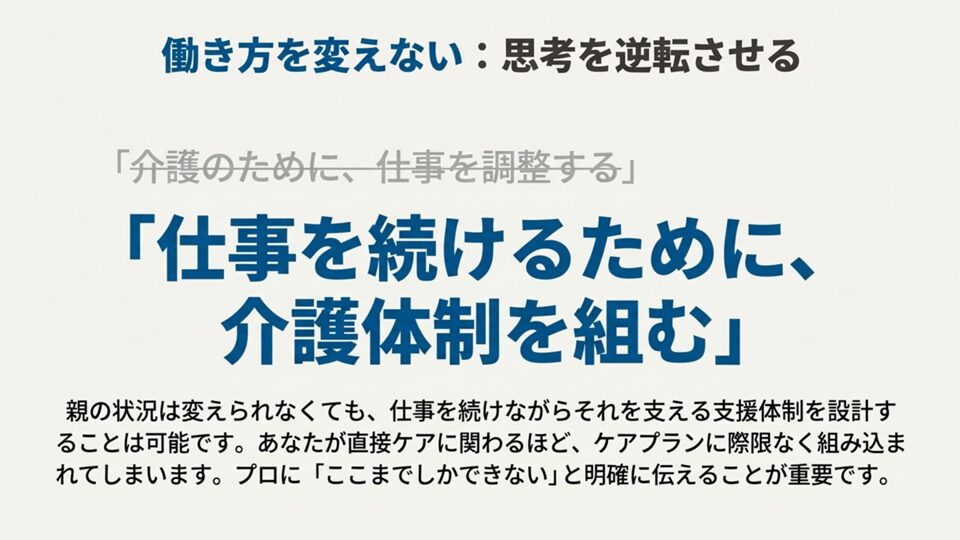 まずは、「経済的な基盤を守ることこそが、長く安定して親を支える力になる」と考え直してください。「今の仕事を辞めない」と固く決意することから、介護との両立は始まります 。