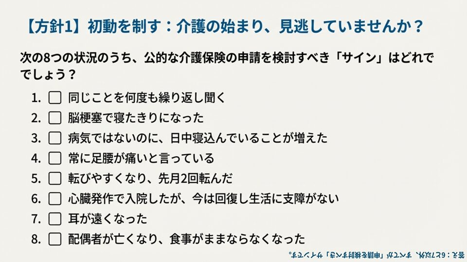 介護の負担を最小限に抑える鍵は**「最初の動き(初動)」**にあります 。 多くの人は、親が転倒して骨折したり、脳梗塞で倒れたりといった「決定的な出来事」が起きてから動き出します 。