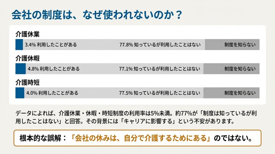 介護のために会社を休む制度を使っている人は、実は5%未満と非常に少ないのが現実です 。