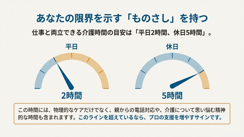 仕事をしながら介護を続ける上で、ご自身の限界を示す「ものさし」を持ってください。 その目安が**「平日2時間、休日5時間」**です 。